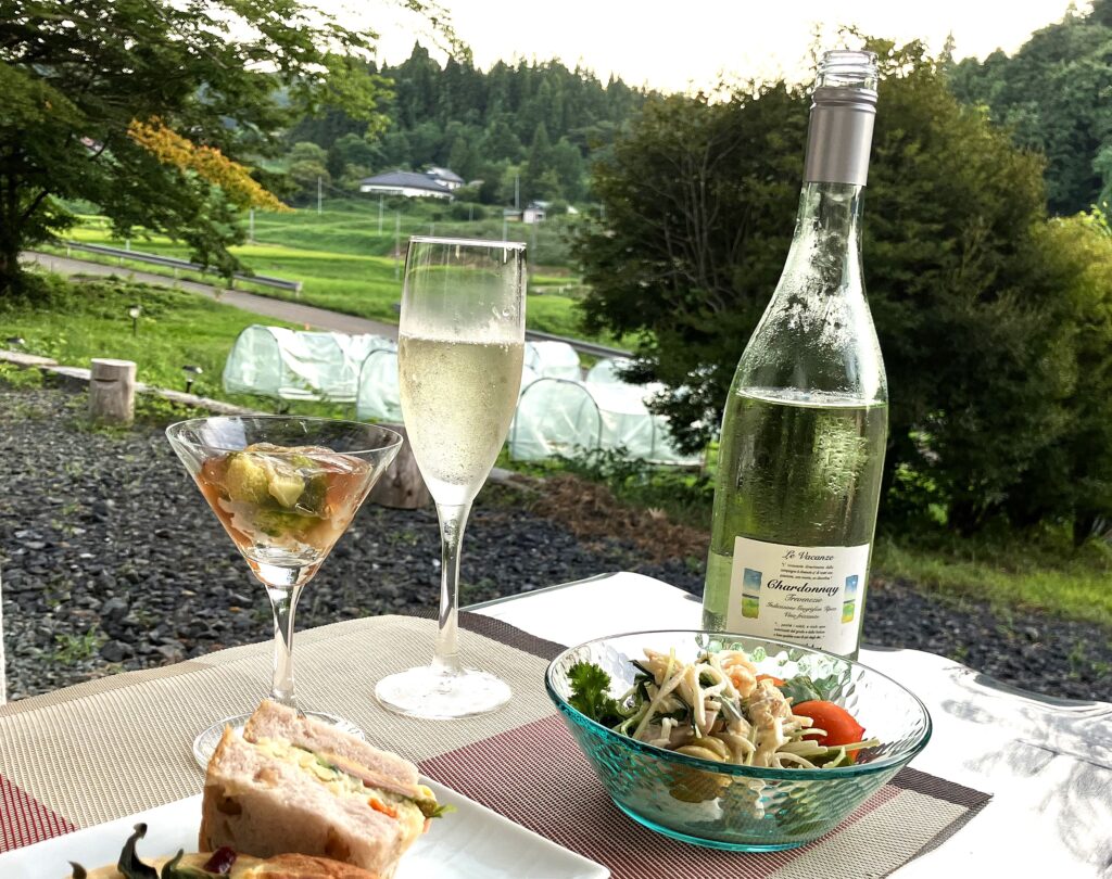 結パークフォーレストのテラス席から園内のブドウ畑や遠くの棚田をながめ、ワインを楽しめる季節がまた戻ってきました。