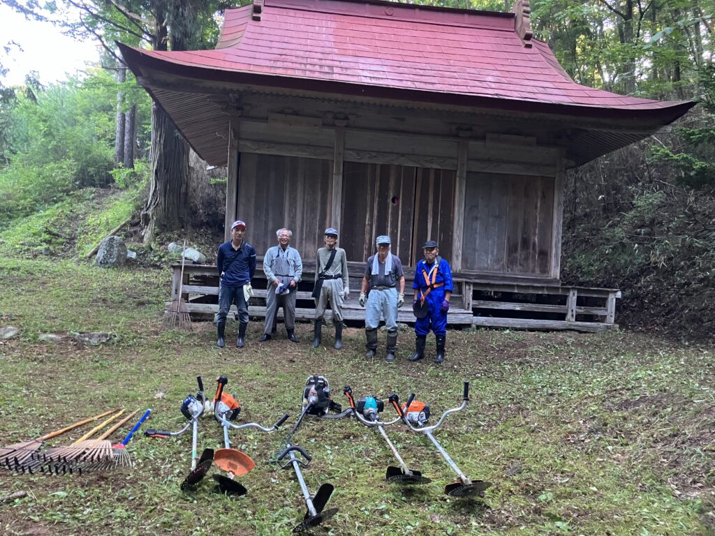 結パークフォーレストの裏山にある出羽神社のお祭りが行われてきた9月20日に向けて、近隣の人々と共に参道の草刈りを行う「結」の集まり(イメージ)に参加しました。早朝5時半から草刈り機やほうきで参道とお社のある山頂の境内をきれいに整備し、とても清々しい気持ちになりました。