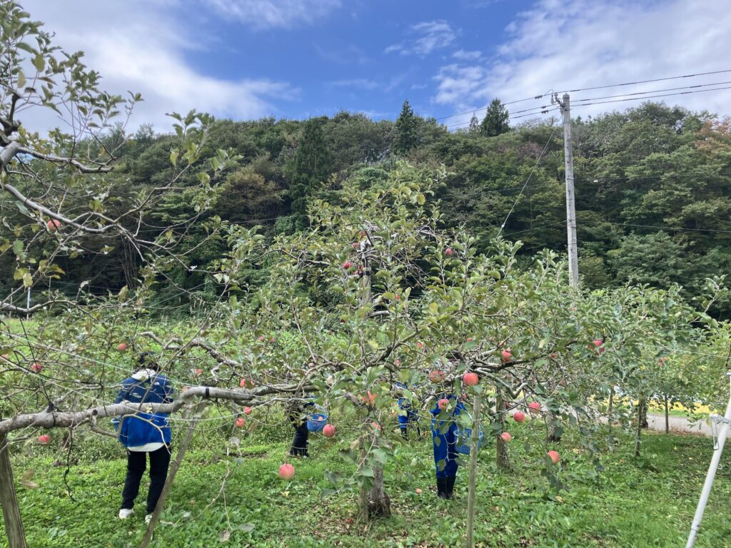 隣のりんご農園にて収穫体験をして、結パークフォーレストでは、里山整備の大切さを実体験してもらいました。
