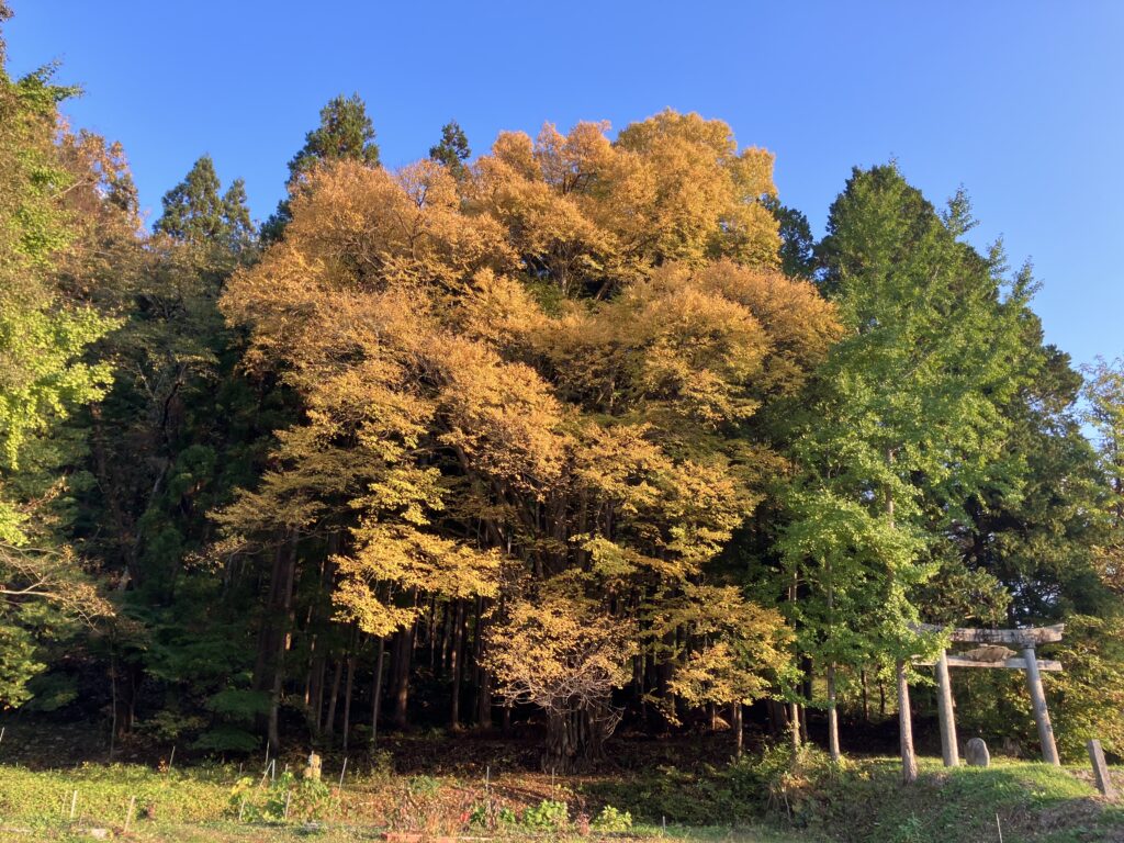 出羽神社の鳥居脇にあるシンボルツリー「桂の木」の見事な黄葉。